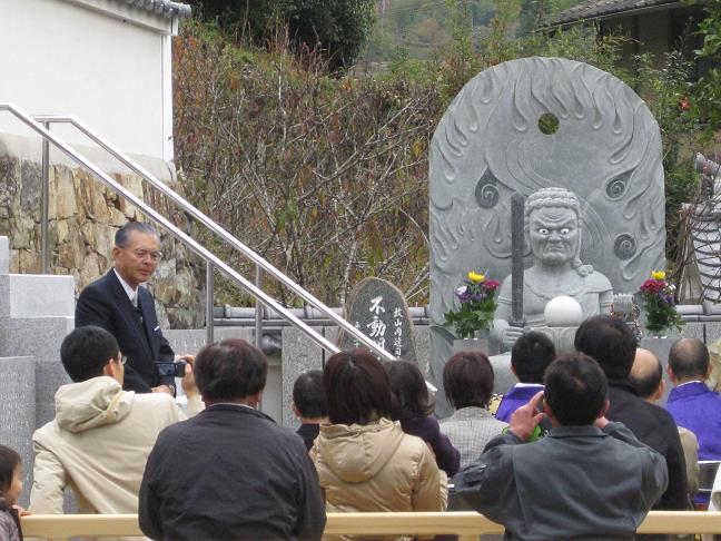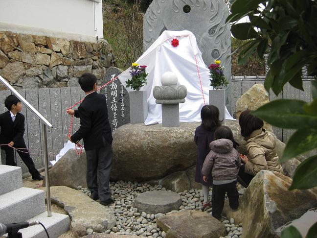 11月22日、山内家ご一行様は朝日寺で山内達司氏の二十五回忌法要と朝日寺墓苑へのお参りを済ませた後、不動明王開眼法要に臨みました。お孫さん4人が除幕。この日まで幕で覆われていたお顔が現れた時には、「おーっ!」という声が上がりました。