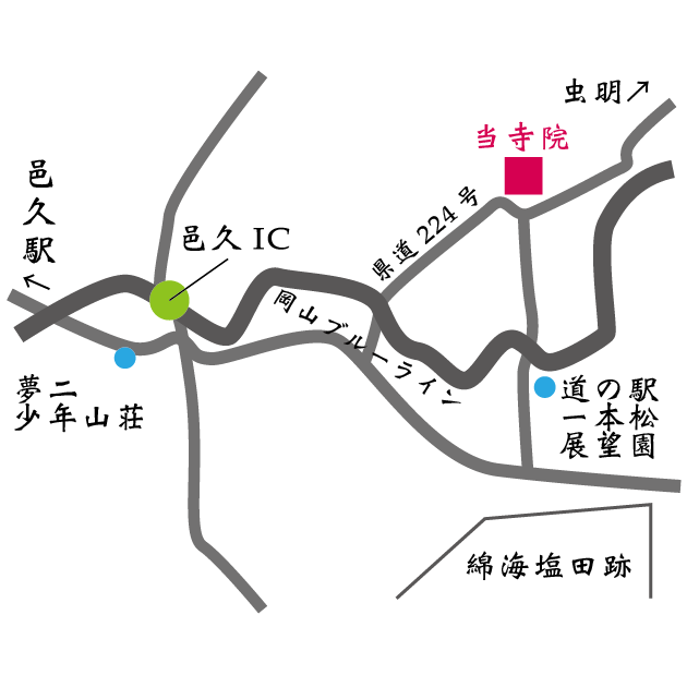 JR赤穂線邑久駅から両備バス虫明線庄田西(東)下車または車・タクシーで10分